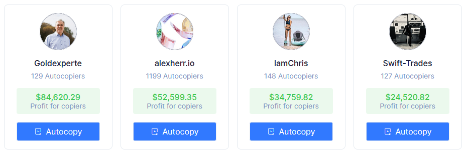 Consulta la tabla de clasificación de los traders y busca por rentabilidad, ROI, número de autocopiadores y otros criterios. Encuentra el que va contigo, y simplemente presiona "Autocopiar".